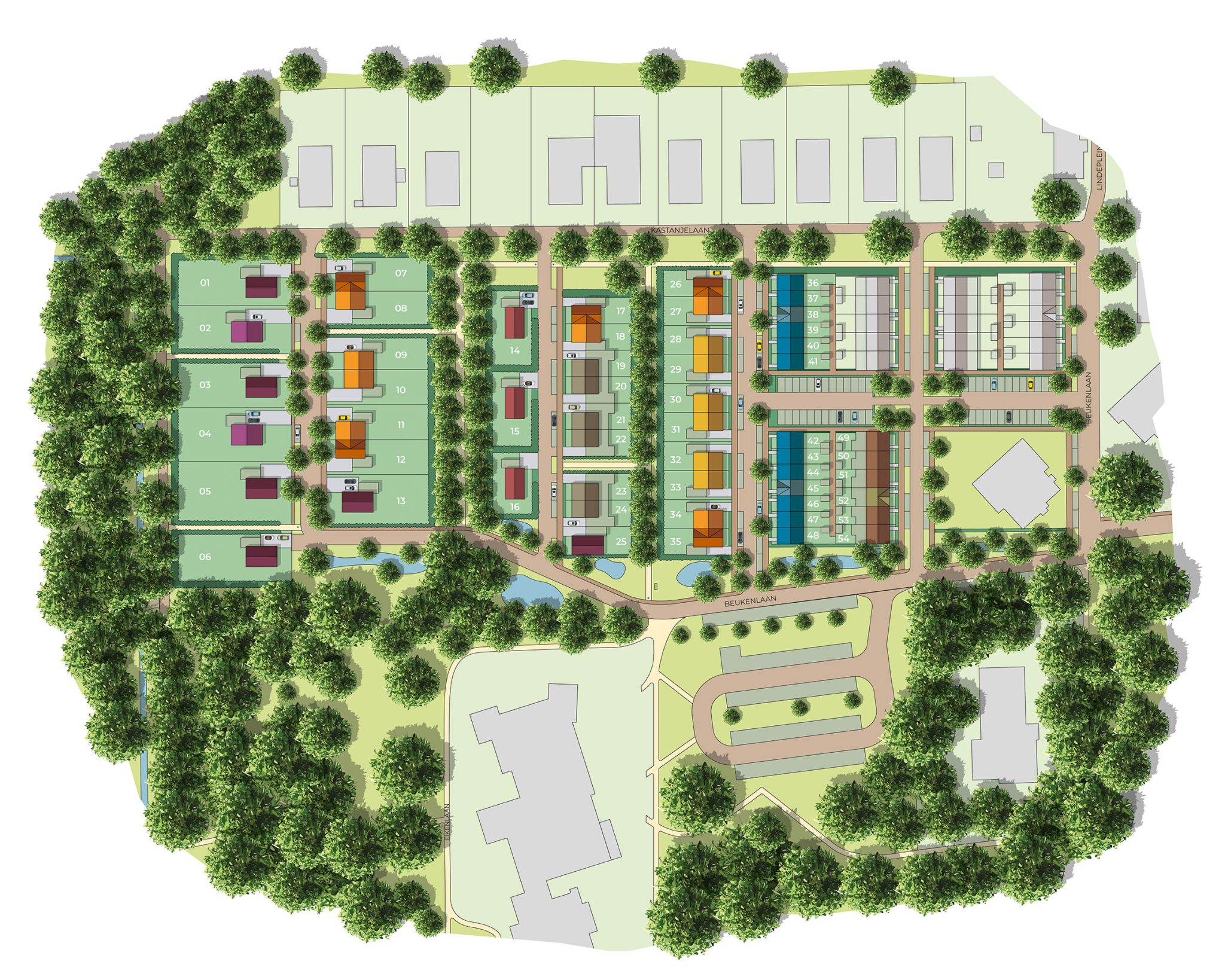 Een deel van de grondgebonden woningen is gesitueerd in deze open plekken, waardoor ๐—ธ๐—น๐—ฒ๐—ถ๐—ป๐—ฒ, ๐—ถ๐—ป๐˜๐—ถ๐—ฒ๐—บ๐—ฒ ๐—ต๐—ผ๐—ณ๐—ท๐—ฒ๐˜€ย ontstaan, omringd door groen. Dit zorgt voor een sterk woongevoel: beschut, rustig en verbonden met de natuur. Andere woningen volgen een stratenpatroon dat direct is afgeleid van bestaande landschappelijke structuren, waardoor de wijk als vanzelf onderdeel wordt van het landschap.