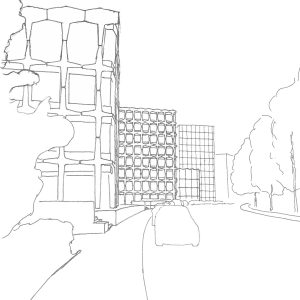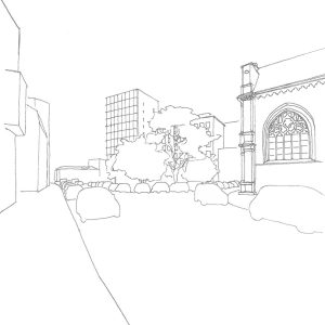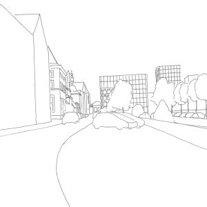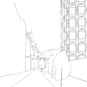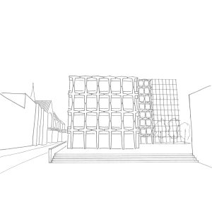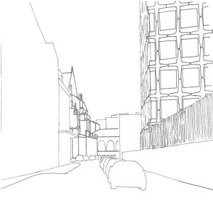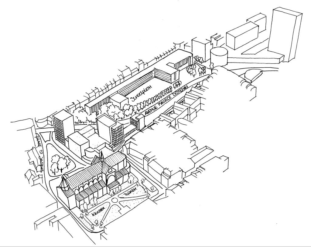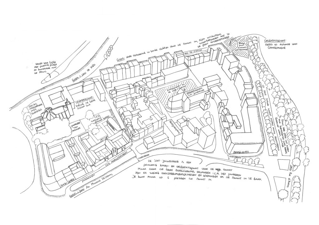Bovenstaande analytische schets brengt de probleemstelling van de projectlocatie in beeld. Historische verbindingen in het centrum van Luik zijn verbroken door de bouw van nieuwe, brutalistische gebouwen. Hierdoor is de verbinding tussen de buurt rondom de Sint-Jakobskerk en het centrum verbroken. In mijn afstuderen ben ik op zoek gegaan naar een oplossing om deze verbinding te herstellen, maar het brutalistische gebouw zo veel mogelijk te behouden.