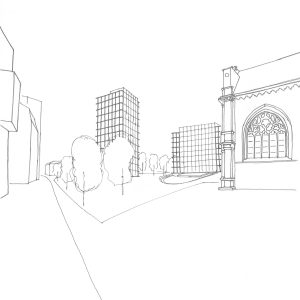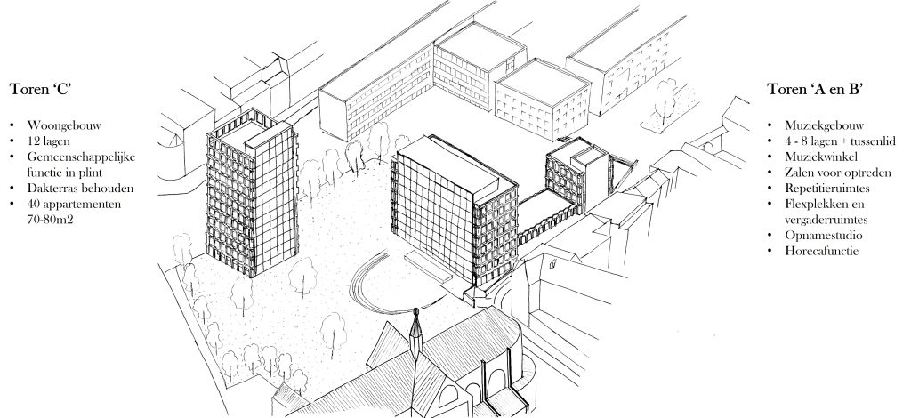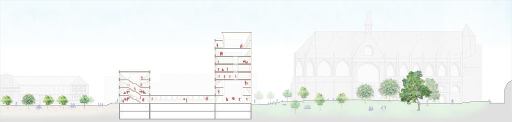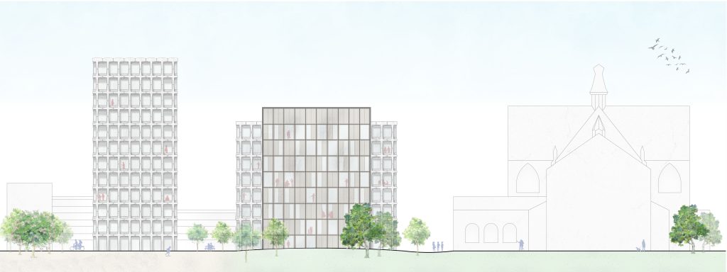 De belangrijkste architectonische ingreep die ontstaat zijn de twee ‘nieuwe gezichten’ aan het park richting de kerk. Voorheen stonden hier andere gebouwen tegenaan en waren het gesloten gevels waar de stijgpunten achter zaten. Ik vind het belangrijk deze gevels vrij te maken en de interactie tussen de gebouwen en het park te verbeteren.